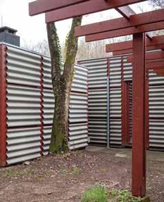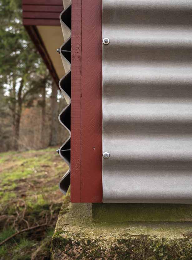 Udvidelsen beklædes med samme system af eternitplader som hovedhuset. Samtidigt tilføjes et drivhus på østfacaden. Den skulpturelle trækonstruktion sætter en accent på den meget lange facade og skaber en blødere overgang mellem hus og natur. Dermed fortsættes pergolaens formidlende