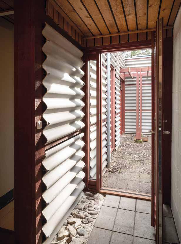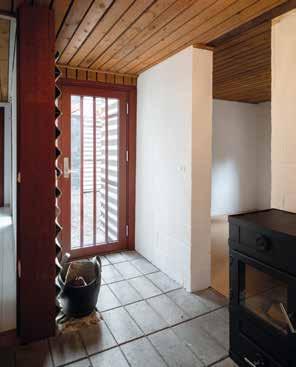 Indgangspartiet tilbygningen til Thyrrings eget hus er en leg mellem ude og inde, hvor uderummets eternitplader, marksten og betonfliser er ført med indenfor.