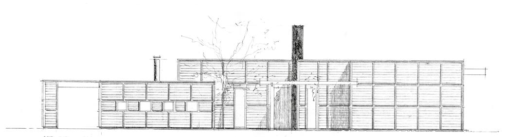 Den lille tegnestue har kun få vinduer og afviger dermed stærkt fra hovedhusets udstrakte rum. En pergola forbinder de to bygninger og strækker sig samtidigt ud mod ankomstpladsen foran huset, hvor søjlerne spiller sammen med træernes stammer. Nogle år efter opførelsen aflukkes passagen mellem bygningerne med et spinkelt vindfang af glas, således at pergolaen fortsat fornemmes som bindeled mellem huset og naturen.