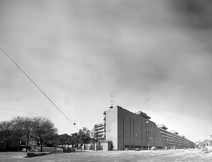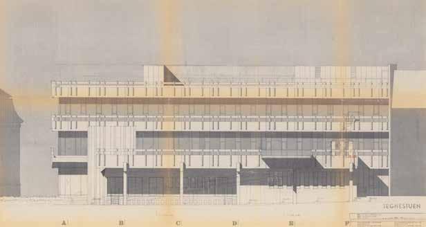 Tegning af varehus for Schou-Epa til filial i Herning. Bygningen er streng betonbrutalisme og opført i 1968.