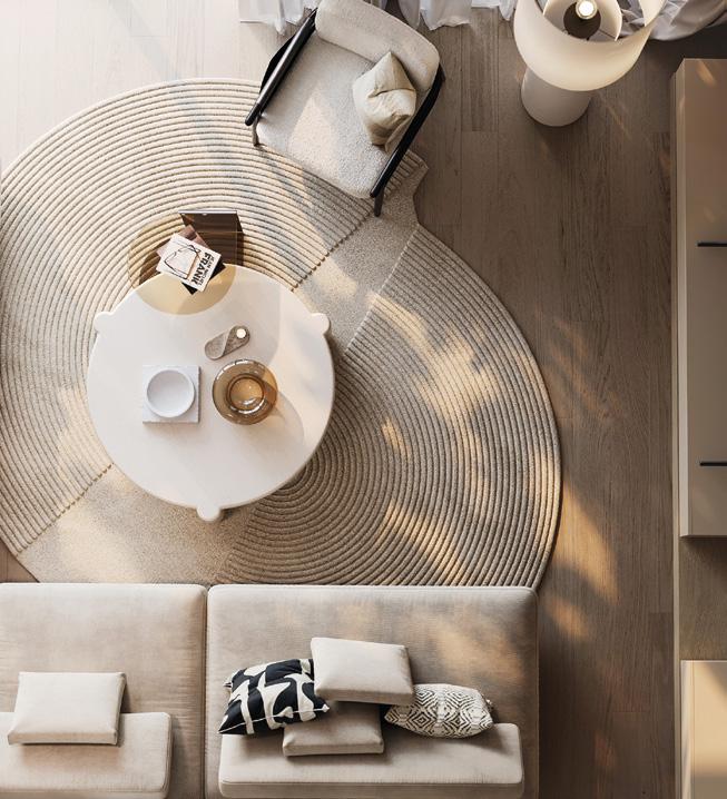 Playing with simplicity and respecting minimalism means turning unexpected aspects of the interior into art. In an environment dominated by muted colors, shapes and textures become integral when it comes to adding depth and dynamism to a room. Wall coverings play a major role in achieving this goal and are therefore becoming an increasingly popular decorating technique. In an atmosphere of neutral tones, specific silhouettes are what our eyes become focused on. As well as bringing a sense of dynamism, the curved walls of an open-plan living room help to visually connect different areas of the space, mak-