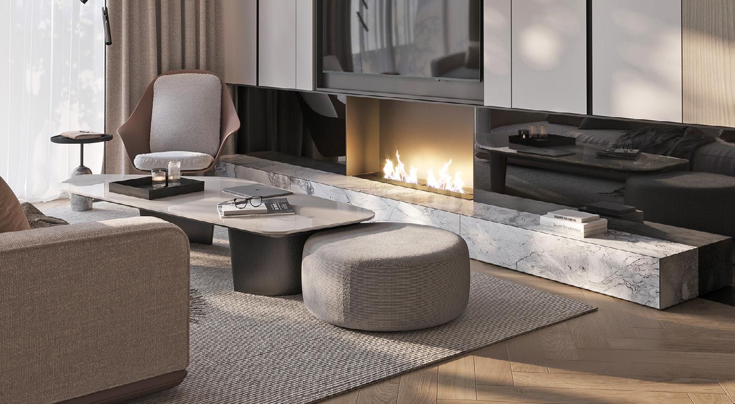 Poslednja, ali ne i manje popularna stavka pri uređenju dnevne sobe, jeste kamin. Kamin nastavlja da bude tražen element u današnjim modernim enterijerima. Upotreba kamina evoluirala je kako bi se uskladila sa savremenim dizajnom i životnim potrebama, pa tako i njegov dizajn prati filozofiju minimalizma i organskog izgleda u prostoru.