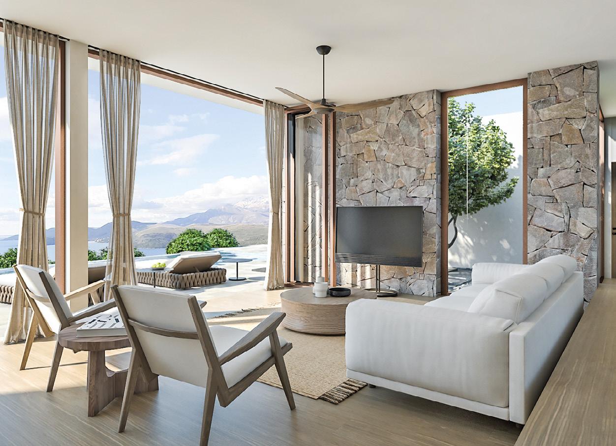 Rafinirani, savremeni dizajn enterijera prostranih vila sa vrhunskim nameštajem „uokviruje“ pogled na Jadran, kroz visoke prozore i dvokrilna vrata koja prostoru daju obilnu prirodnu svetlost, strujanje vazduha i osećaj vazdušaste lakoće. Kameni zid je, uz kamin, glavna odlika dnevne sobe koja pruža udoban celodnevni boravak, uz druženje sa porodicom i prijateljima. Kupatilo je takođe opremljeno u kamenu, uz najsavremenije elegantno uklopljene elemente. Kompletan komfor u vilama osigurava podno grejanje i parket od najkvalitetnijeg hrastovog drveta, što