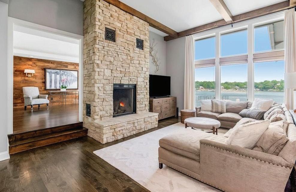 Inside, this nearly 7,000 sq ft showpiece home provides breathtaking lake views. Custom features throughout, including a reclaimed wood accent wall, new hardwood floors in living room and primary bedroom, designer lighting,