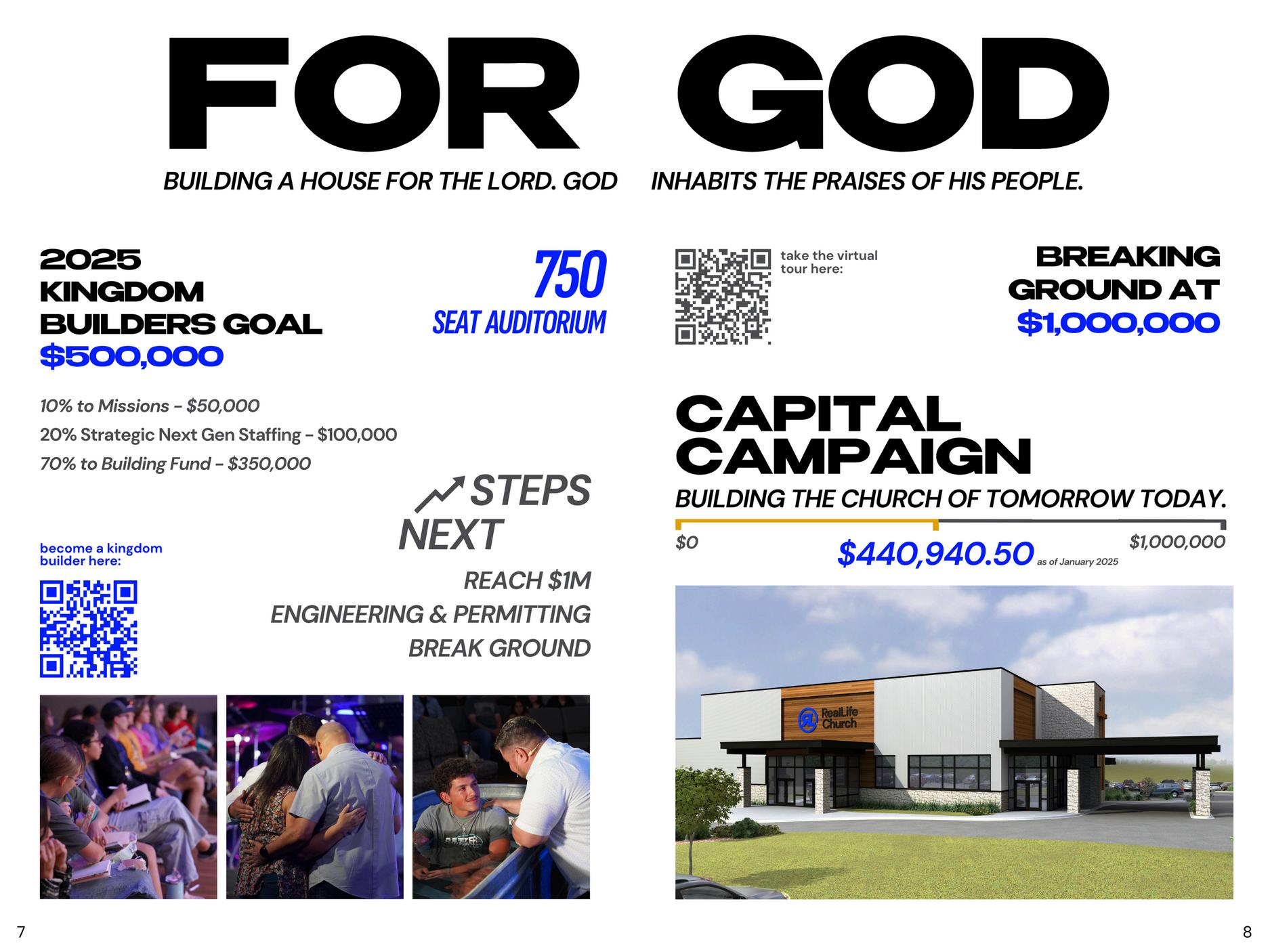 This year we will all have an opportunity to be a part of something amazing. We are at a very significant moment in the vision for Real Life Church. In the coming years, our impact will be multiplied exponentially around the world because of our strategic investment in the building today. We are incredibly blessed to be part of a church committed to bring Real Hope and Real Change to hurting people. We love you and can’t wait to see what God has in store for 2025. HE IS FAITHFUL!!!