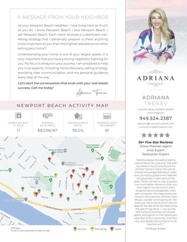 STATUS BEDS BATHS EST. SQ. FT.* LIST PRICE Active 5 5.1 7,100 $11,995,000 Active 5 4.2 8,100 $10,000,000 Active 5 5.3 6,200 $9,995,000 Active 6 5.2 7,600 $8,995,000 Active 3 1.0 1,300 $5,995,000 Active 3 2.1 1,800 $1,369,000 STATUS ADDRESS BEDS BATHS EST. SQ. FT. LIST PRICE SOLD PRICE SOLD DATE Sold 104 Kings Road 4 6.2 8,926 $14,995,000 $13,830,000 01/07/22 Sold 230 Kings Road 5 5.1 6,984 $12,000,000 $12,000,000 05/11/22 Sold 1010 Kings Road 6 5.1 6,416 $11,995,000 $11,140,000 10/14/22 Sold 660 Kings Road 5 6.1 4,861 $6,999,000 $6,650,000 11/17/21 Sold 530 Kings Road 4 4.3 6,436 $6,900,000 $6,200,000 03/31/22 Sold 519 Signal Road 6 6.1 3,858 $4,995,000 $4,650,000 05/03/22 Sold 1601 Kings Road 5 5.0 5,200 $5,500,000 $4,650,000 12/02/21 Sold 501 Signal Road 3 2.0 1,647 $3,295,000 $3,500,000 05/18/22 Sold 702 Saint James Place 5 4.0 3,018 $3,600,000 $3,500,000 04/02/22 Sold 309 Kings Road 3 2.1 1,819 $3,200,000 $3,180,000 12/31/21 Sold 1905 Haven Place 4 3.1 3,041 $2,300,000 $2,166,500 06/27/22 Adriana Trenev and Coldwell Banker Realty are not in any way affiliated with any Newport Beach Home Owners Association, nor is this in any way an official advertisement or publication of Newport Beach. © 2022 All rights reserved. This representation is based on sales and data reported by multiple brokers/agents to the CRMLS between November 17th, 2021 and November 7th, 2022. Listings and sales may not be those of Coldwell Banker Realty. The CRMLS does not guarantee the accuracy of this data, which may not reflect all the real estate activity in the area. E&OE covered. This market report is not intended to solicit properties already listed for sale nor intended to cause a breach of an existing agency relationship.