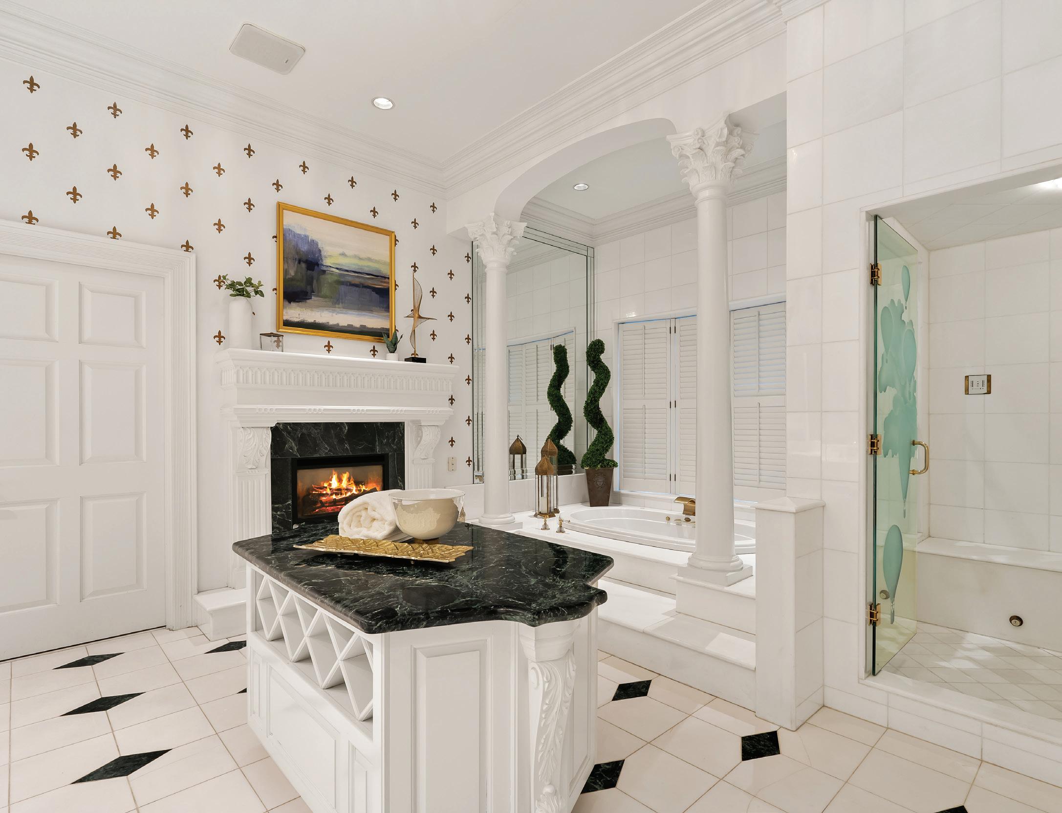 The lower level is a haven for entertainment, offering a custom bar, billiards room, and a 19-seat movie theater complete with a marquee and concession stand. The home fitness center with an adjoining bath offers fitness opportunities. Outdoors, resort-style amenities abound: a 120,000-gallon pool with a swim-up bar, hot tub, sunbathing island, pool house, and a newly renovated outdoor kitchen. Tennis enthusiasts will appreciate the regulation-size, lighted court, while terraces invite al fresco gatherings.