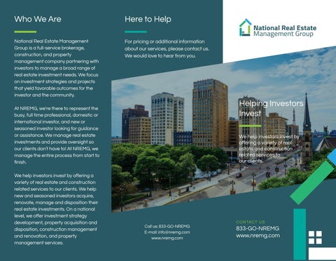 National Real Estate Management Group is a full-service brokerage, construction, and property management company partnering with investors to manage a broad range of real estate investment needs. We focus on investment strategies and projects that yield favorable outcomes for the investor and the community.