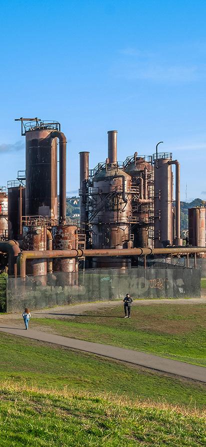Explore the transformed remnants of Seattle Gas Light Company’s gasification plant, now a vibrant public park designed by Richard Haag. Wander among original towers, tanks, and pipes, repainted and refurbished for playful exploration. Nearby, enjoy open green spaces for kite-flying, frisbee, and picnics. Ascend the man-made hill crowned by a 28-foot sundial.