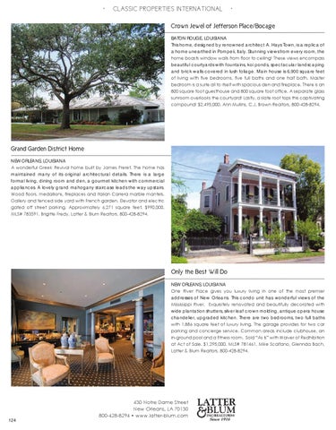 Crown Jewel of Jefferson Place/Bocage ................................................................................................................................................................................... Baton Rouge, Louisiana This home, designed by renowned architect A. Hays Town, is a replica of a home unearthed in Pompeii, Italy. Stunning views from every room, the home boasts window walls from floor to ceiling! These views encompass beautiful courtyards with fountains, koi ponds, spectacular landscaping and brick walls covered in lush foliage. Main house is 6,900 square feet of living with five bedrooms, five full baths and one half bath. Master bedroom is a suite all to itself with spacious den and fireplace. There is an 800 square foot guesthouse and 800 square foot office. A separate glass sunroom overlooks the courtyard! Lastly, a slate roof tops this captivating compound! $2,495,000. Ann Mullins, C.J. Brown Realtors, 800-428-8294.