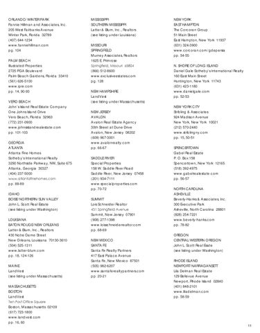Mississippi Southern Mississippi Latter & Blum, Inc., Realtors (see listing under Louisiana) Missouri Springfield Murney Associates, Realtors 1625 E. Primrose Springfield, Missouri 65804 (866) 512-8600 www.exclusiveestates.com pg. 128 New Hampshire LandVest (see listing under Massachusetts) New Jersey AVALON Avalon Real Estate Agency 30th Street at Dune Drive Avalon, New Jersey 08202 (609) 967-3001 www.avalonrealty.com pp. 66-67 SADDLE RIVER Special Properties 158 W. Saddle River Road Saddle River, New Jersey 07458 (201) 934-7111 www.specialproperties.com pp. 70-72 Summit Lois Schneider Realtor 431 Springfield Avenue Summit, New Jersey 07901 (908) 277-1398 www.loisschneiderrealtor.com pp. 68-69 New Mexico Santa Fe Santa Fe Realty Partners 417 East Palace Avenue Santa Fe, New Mexico 87501 (505) 982-6207 www.santaferealtypartners.com pp. 20-21