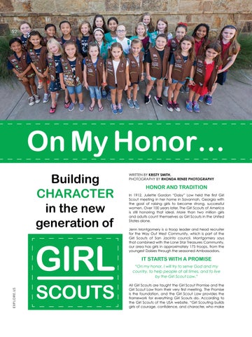 HONOR AND TRADITION In 1912, Juliette Gordon “Daisy” Low held the first Girl Scout meeting in her home in Savannah, Georgia with the goal of raising girls to become strong, successful women. Over 100 years later, The Girl Scouts of America is still honoring that ideal. More than two million girls and adults count themselves as Girl Scouts in the United States alone. Jenn Montgomery is a troop leader and head recruiter for the Way Out West Community, which is part of the Girl Scouts of San Jacinto council. Montgomery says that combined with the Lone Star Treasures Community, our area has girls in approximately 175 troops, from the youngest Daisies through the seasoned Ambassadors.