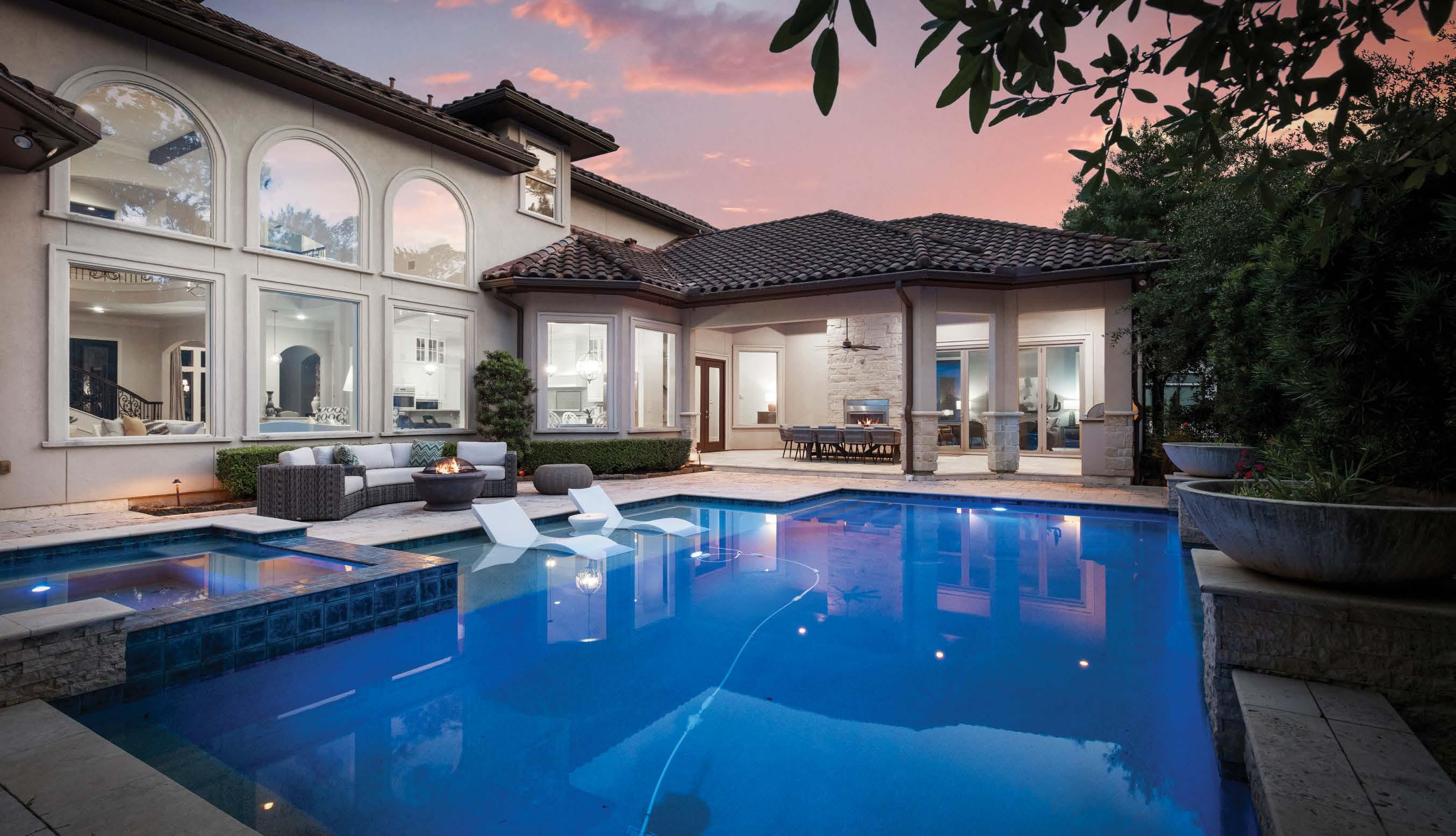 This stunning custom estate is nestled on a private, over half-acre lot in one of the area’s most sought-after neighborhoods. Real hardwood floors extend from the entry through the study and into the elegant formal living and dining rooms, highlighted by a sweeping wrought iron staircase and rich designer finishes. The main level features a luxurious primary suite and an additional guest bedroom, while upstairs you’ll find three more spacious bedrooms, a versatile extra room and a large game room with an outdoor balcony overlooking the beautifully landscaped backyard, complete with a sparkling pool, spa, and waterfall. A finished third-floor bonus room adds even more flexible living space. Additional highlights include a chef’s kitchen with custom cabinetry and trim, two fireplaces, a dramatic cathedral ceiling in the formal living room, and a spacious three-car garage. Thoughtfully designed for both everyday living and memorable entertaining, this home radiates warmth, charm, and timeless elegance.