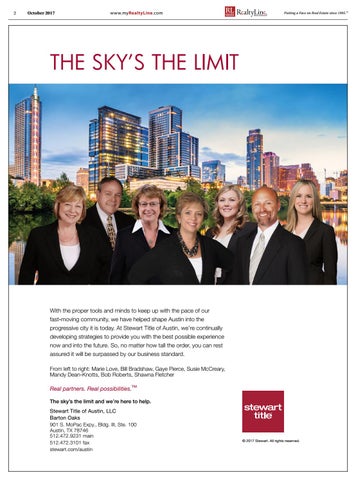 Real partners. Real possibilities.™ The sky’s the limit and we’re here to help. Stewart Title of Austin, LLC Barton Oaks 901 S. MoPac Expy., Bldg. III, Ste. 100 Austin, TX 78746 512.472.9231 main 512.472.3101 fax stewart.com/austin