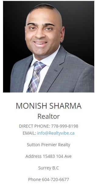 Get in Touch Monish Sharma DIRECT: (778) 999-8198 Sutton Premier Realty OFFICE: (604) 581-8400 ADDRESS: 15483 104 Ave Surrey, BC V3R 1N9