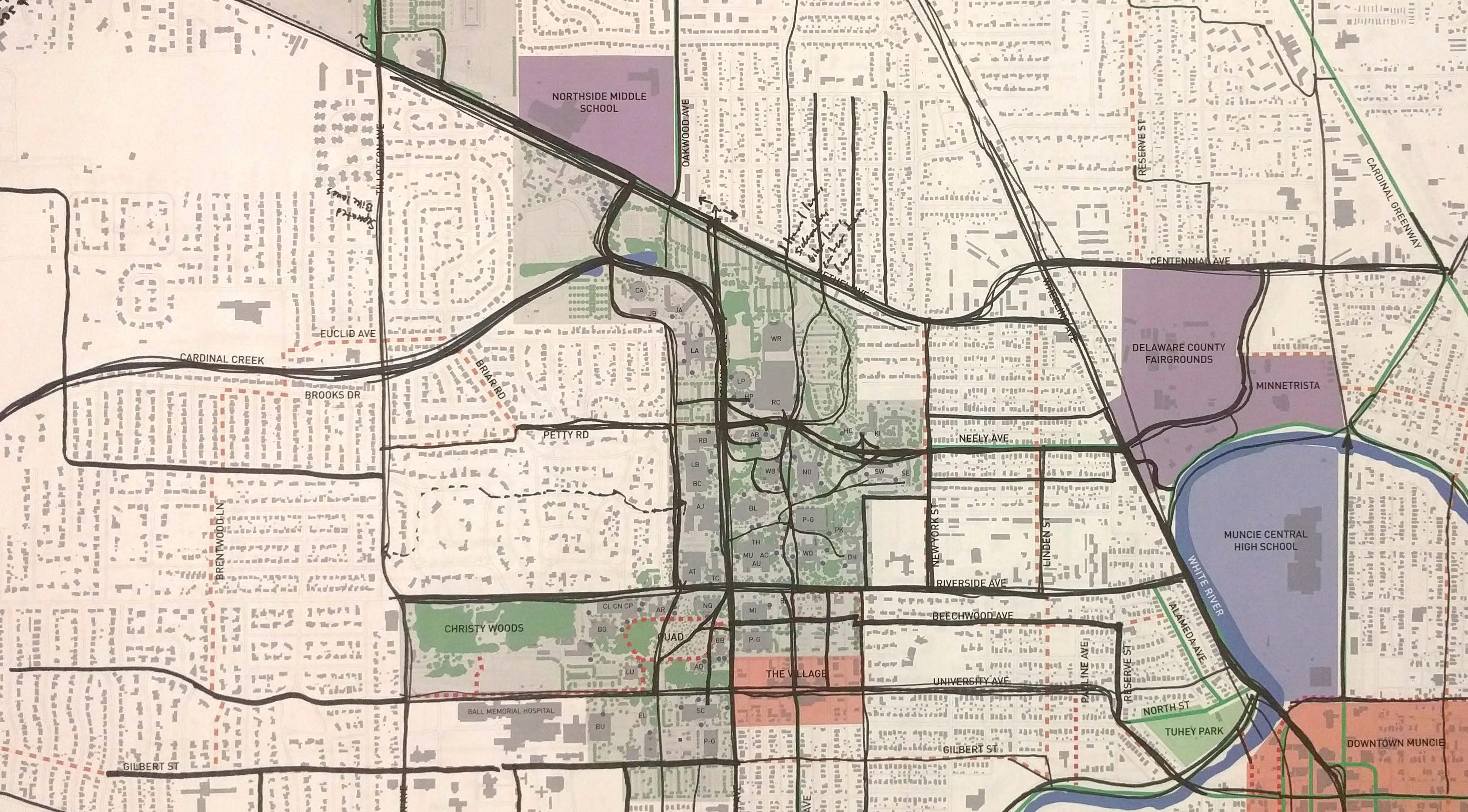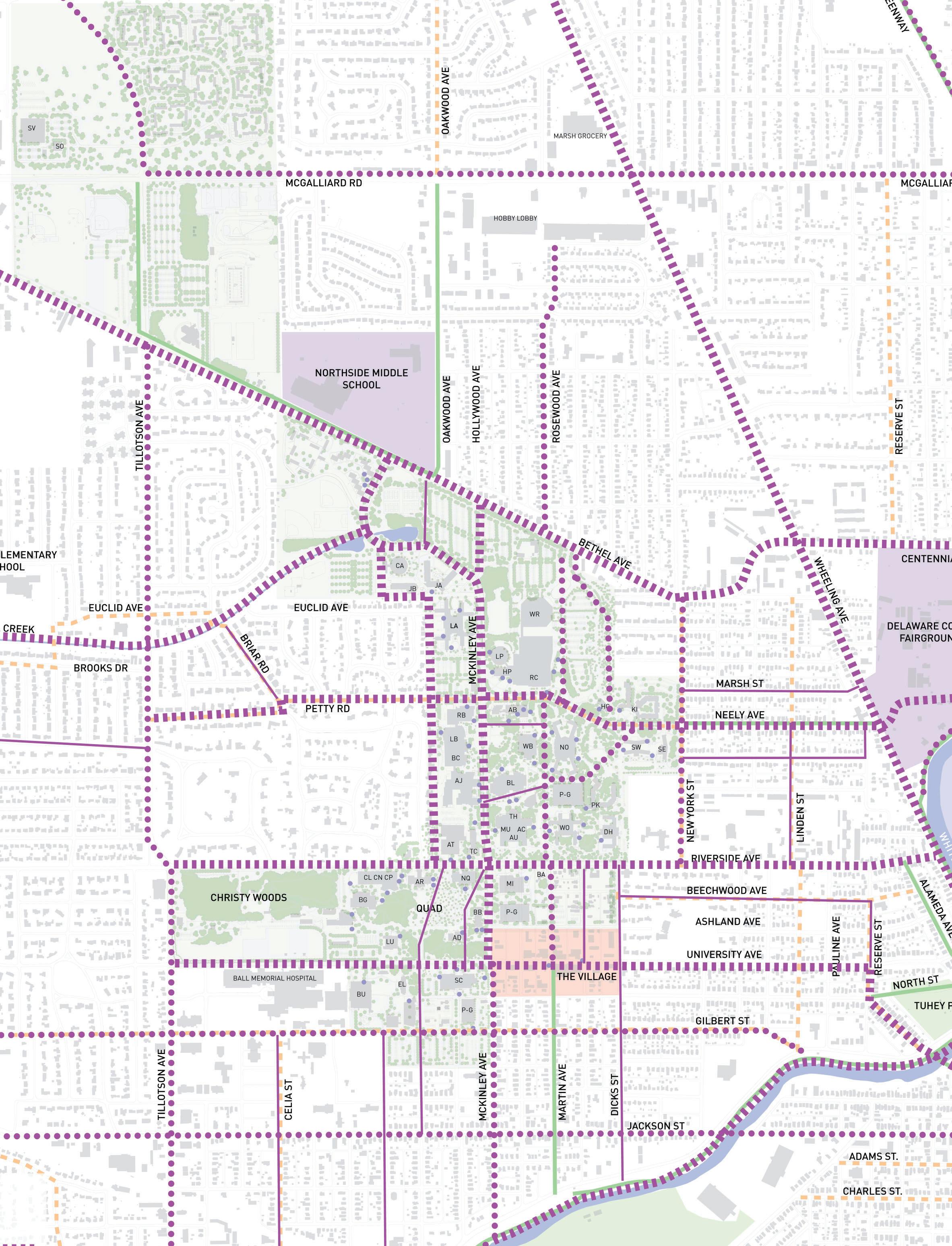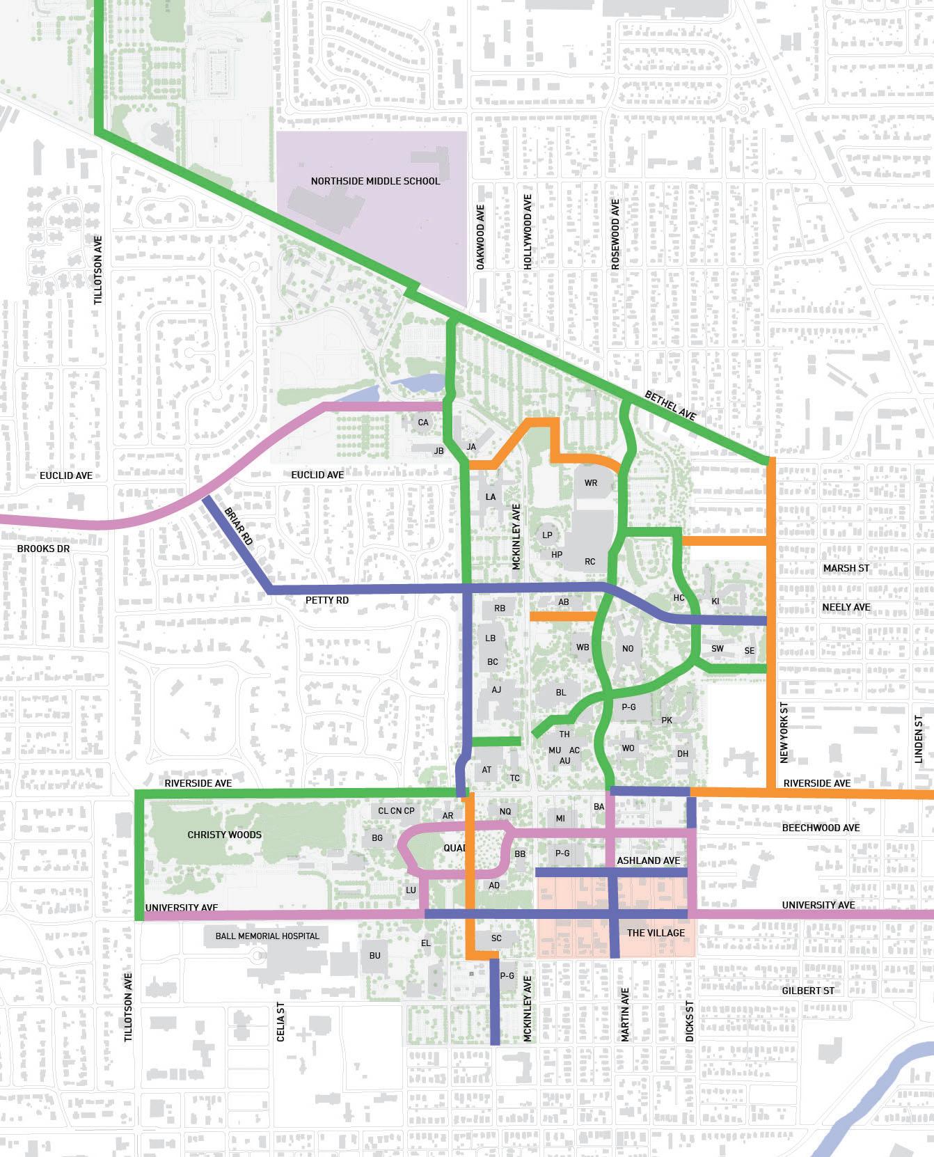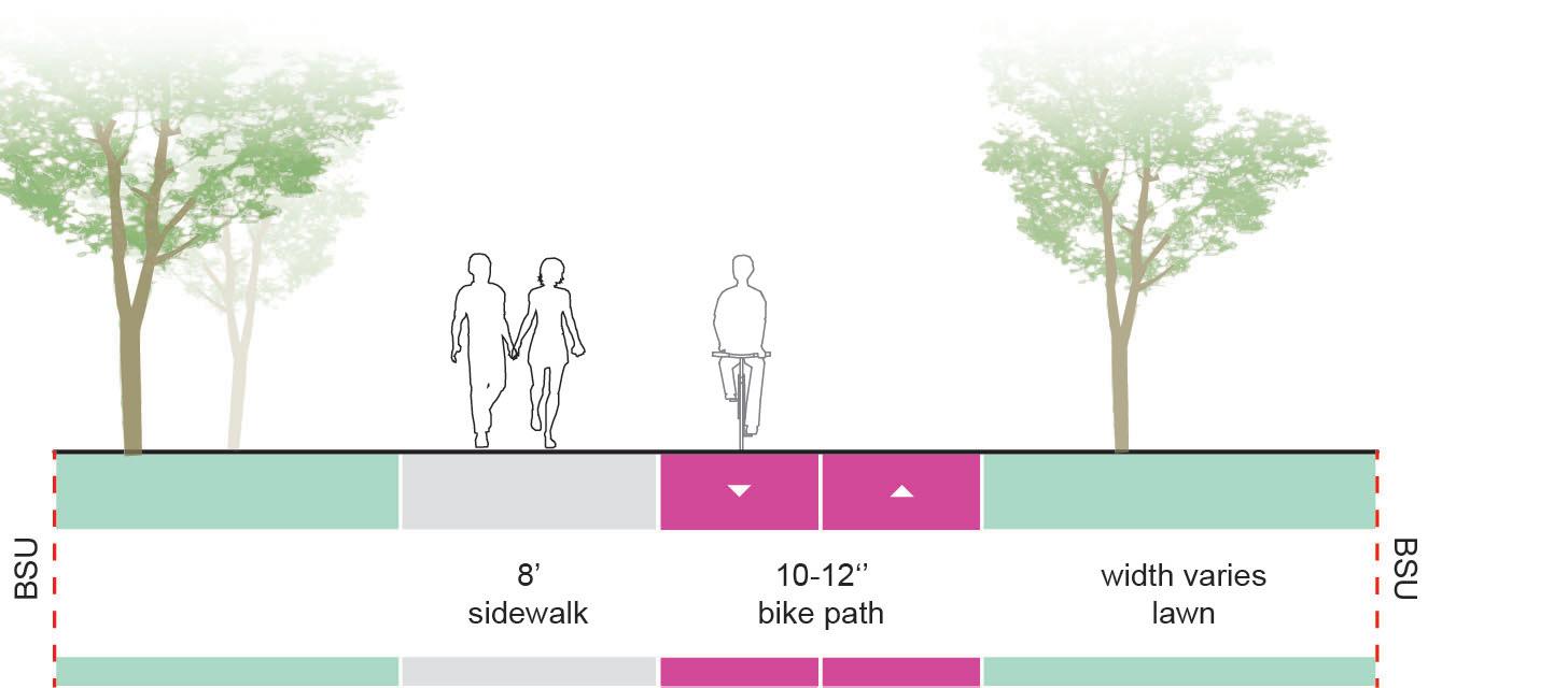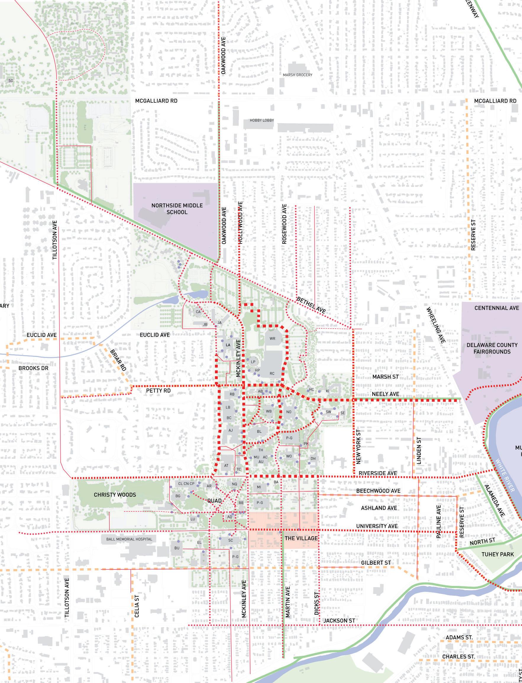 Work with the City of Muncie to fully implement the “Complete Street Policies”, especially where local streets intersect and have an impact on campus mobility. Connections to the White River Greenway, Minnetrista, and downtown Muncie should be considered.
