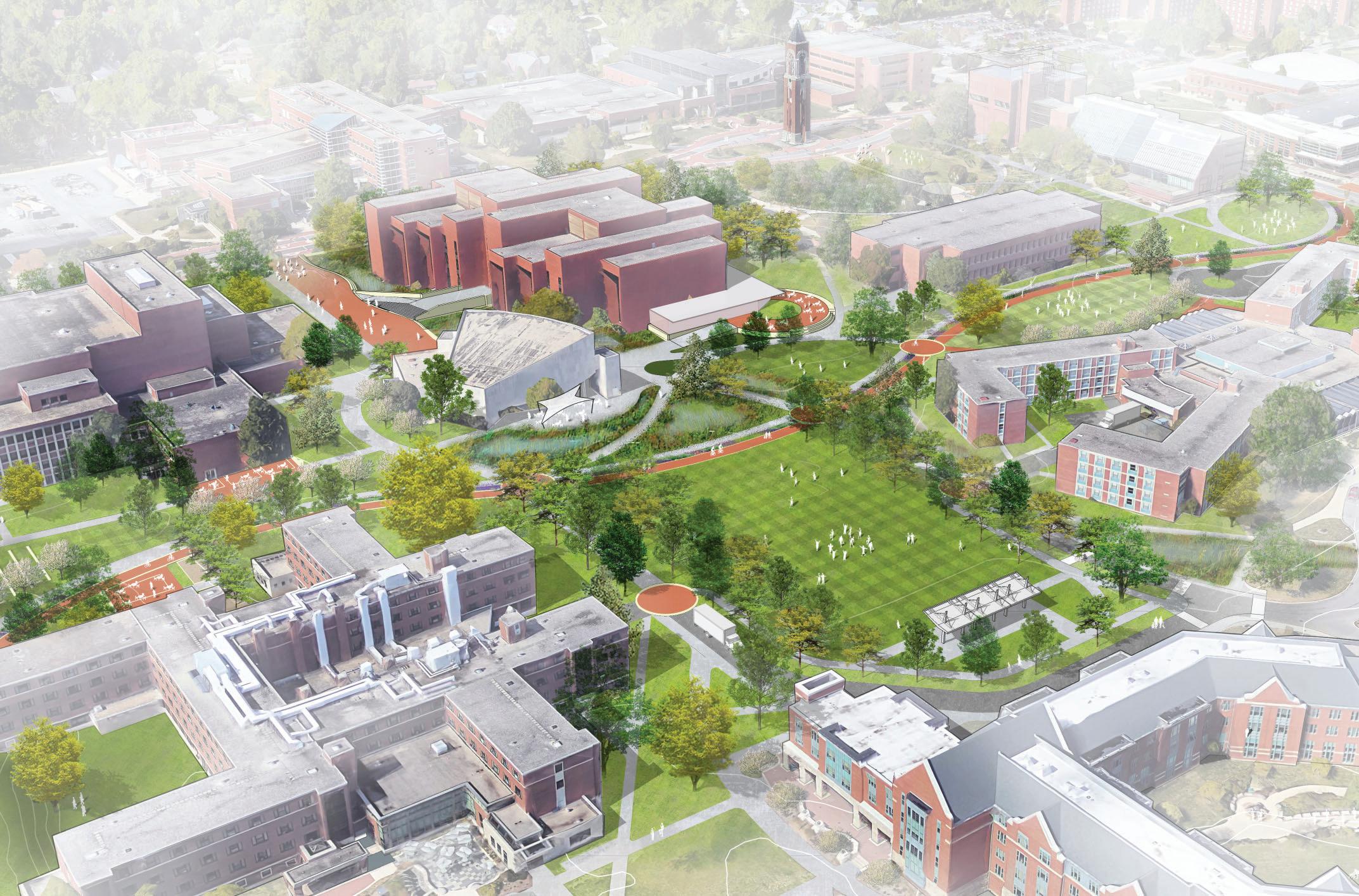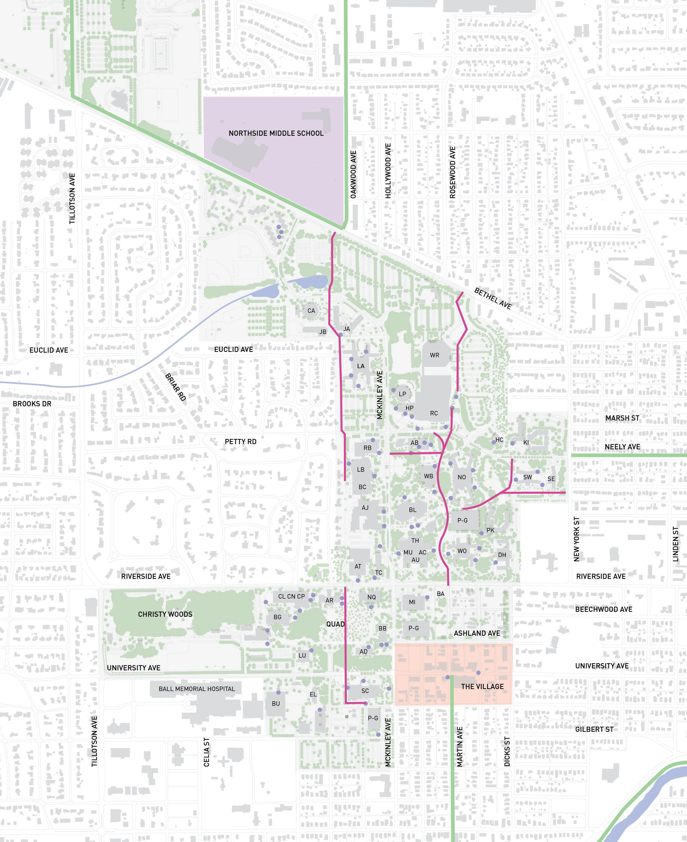 The Master Plan will focus on improving campus mobility and circulation. Priority was placed on separating facilities for bicycles and pedestrians, and understanding where new shared-use routes could occur. Existing routes could be enhanced to connect to critical destinations on campus and in the City of Muncie. Two critical on-campus routes that were studied included the Cow Path enhancements and future considerations for the East Mall bike path.