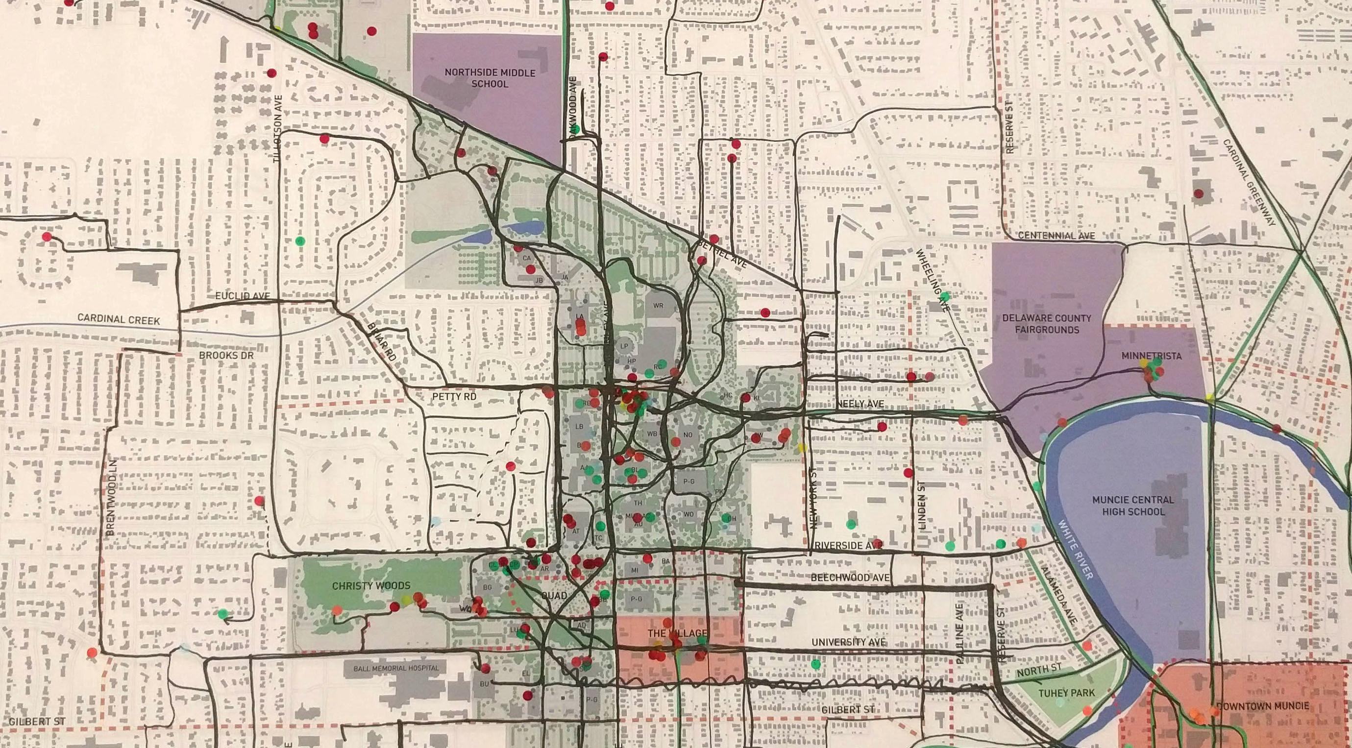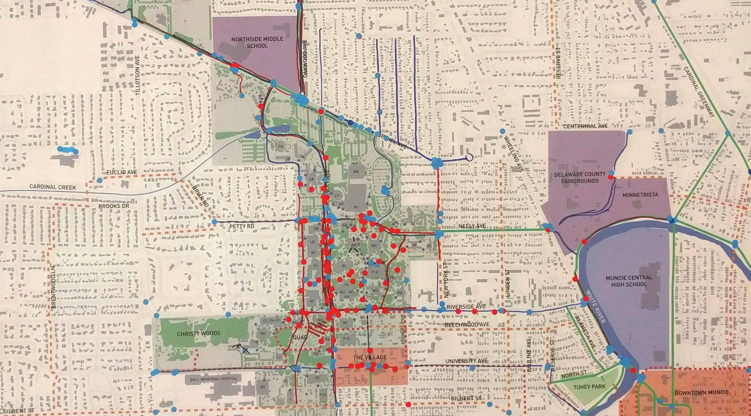 Provide and distribute a printed Bike Map, that identifies the types and locations of dedicated bicycle routes and shared-use routes. Coordinate with the City of Muncie and BikeMuncie to indicate routes that connect to important destinations near the University. Maps should be available at popular destinations on campus (AJ, Bracken, Student Center, Gora Rec Center).