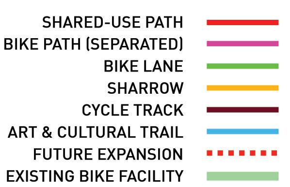 • Major Connectors: Major bicycle routes that make connections to the surrounding community and existing destinations.