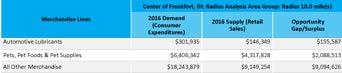 The retail gap analysis focuses on the money spent at each type of retail store, while the merchandise analysis uses money spent on types of merchandise, regardless of the type of store. The analysis will provide insight to opportunities to target underserved markets. The figures in red represent a surplus where Frankfort is supplying more than the local consumer demand. The figures in black represent an opportunity gap where the local supply is less than the demand for certain products or stores.