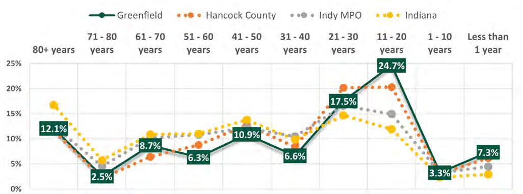 The following charts provide insight into the housing stock and its characteristics. Greenfield had a high occupancy rate in 2020 with 96.4% of housing units occupied. Of Greenfield’s 9,488 occupied housing units, 62% are owner-occupied (also known as the homeownership rate) and 38% are renter-occupied. The home ownership rate is high in Hancock County at 80%, much greater than the City’s occupancy rate (62%). The housing vacancy rate is comparable to the county, with 3.6% of homes vacant in the City and 3.3% in the County.