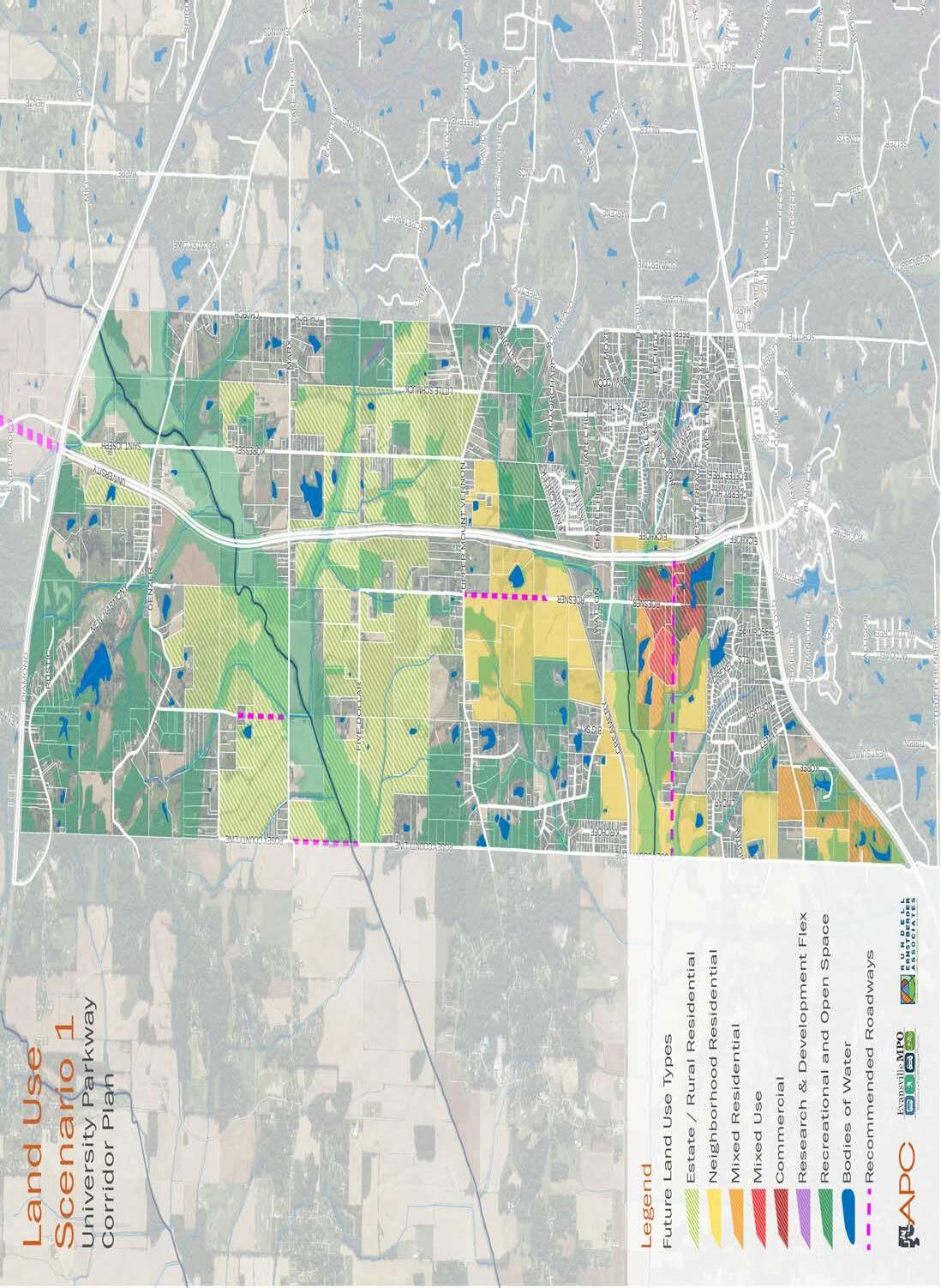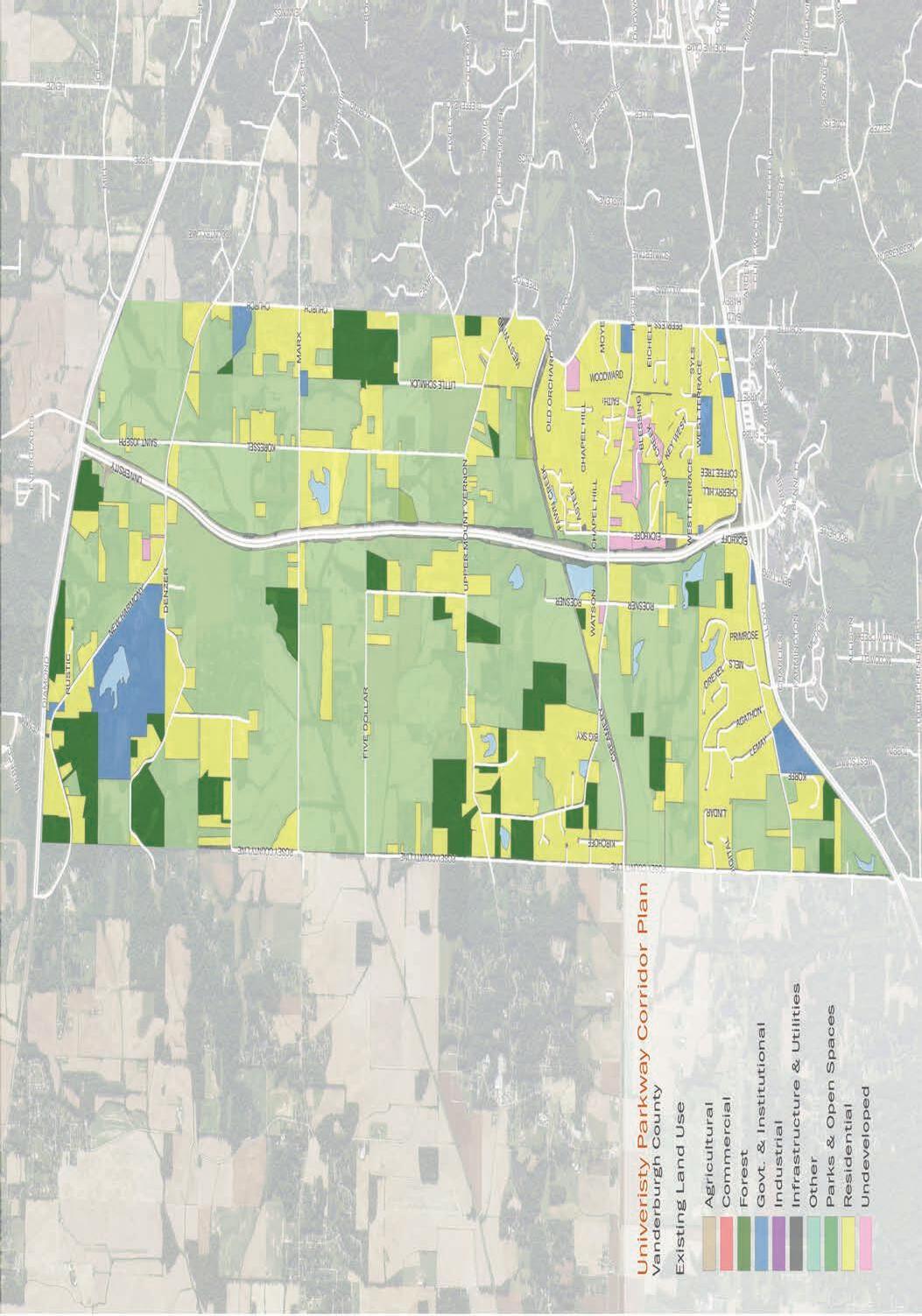 As shown in Figure 1-2: Existing Land Use, the University Parkway Corridor is rural in character with a majority of the uses being agricultural and some residential in clusters. Forested regions are scattered amongst the Parkway. Most of the residential resides south of Hogue Road. Currently most of the corridor is agricultural land use, within which county regulations permit residential subdivisions, and certain special uses allowing them to span the corridor.