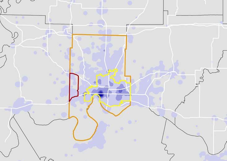 Drivetime zones were created to establish how far people are required to travel for basic services and retail needs. This indicates gaps and what types of retailers may be needed as the study area develops.