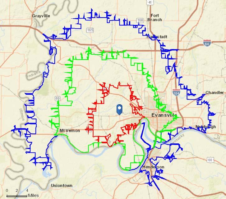 The intersection of Hogue and University Parkway was used as the point of origin to create 10, 20 and 30-minute drivetime areas. These identify levels of convenience for the study area. The ten-minute includes the entire study area and the nearby Lloyd Expressway/Pearl Dr. retail center. The 20-minute zone offers access to the downtown and to a majority of Evansville, including a portion of the Green River Rd. corridor. Finally, the 30-minute area captures a majority of the county.