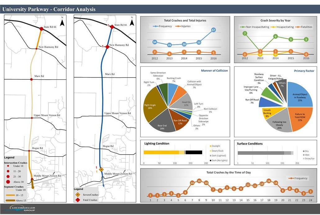 The University Parkway Corridor, being a rural area of Vanderburgh County, still has several major roadways serving it. University Parkway is a minor arterial connecting two major roadways, Lloyd Expressway (SR 62) a principal arterial and Diamond Avenue (SR 66) a major collector. Along this corridor, traffic is relatively low except in select areas. The major peak times for traffic are 7:00 am to 8:00 am and 4:15 pm to 5:15 pm. Most of the corridor manages this traffic well except two intersections, Hogue Road and Upper Mount Vernon Road which have some difficulty during peak hours.