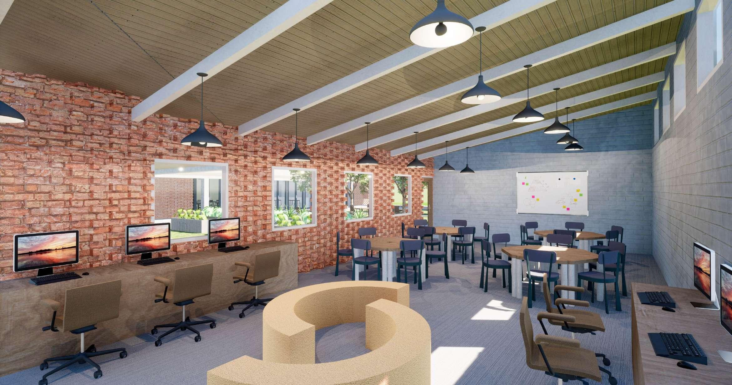 The social, dining, and kitchen areas situated in a centralized back bar configuration. This arrangement encourages interaction among residents, fostering a strong sense of community. Additionally, placing the artist gallery on the corner enhances its accessibility to the public. Connecting parking lot to allow for larger events to utilize it, maintaining a connection between the semi private courtyard to the public gallery and the community.
