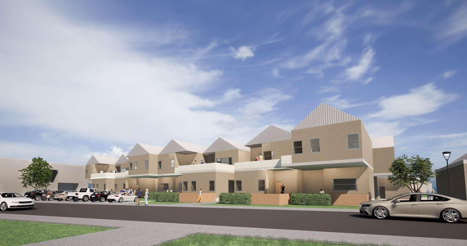 Notably, the main building housing the majority of the units is angled away from the street, ensuring units don’t directly line the roadside.