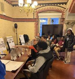 The final presentation was held at Tweed Courthouse and brought together students from Medgar Evers College Preparatory School for a science fair-style event. Students rotated between groups, engaging with each team’s proposals and ideas. Our team, **The Regulatory Roots**, set up an interactive installation featuring a sequence of layered maps that visualized data related to land use, demographics, displacement risk, and housing density. These maps served as both a visual tool and a starting point for critical conversations about data representation and its role in urban planning.