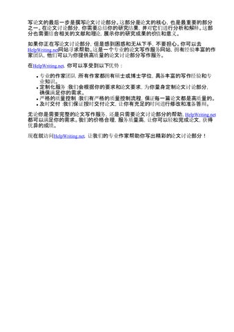 如果你正在写论文讨论部分,但是感到困惑和无从下手,不要担心。你可以去 HelpWriting.net网站寻求帮助。这是一个专业的论文写作服务网站,拥有经验丰富的作 家团队,他们可以为你提供高质量的论文讨论部分写作服务。