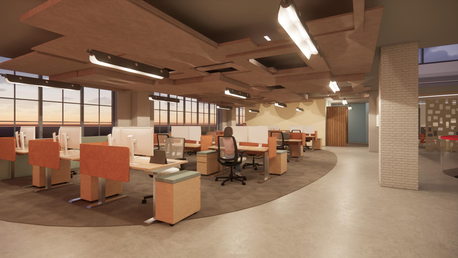 Continuation of material within rooms, lights, and acoustic ceiling in formation to bring attention to the front to help with focus.