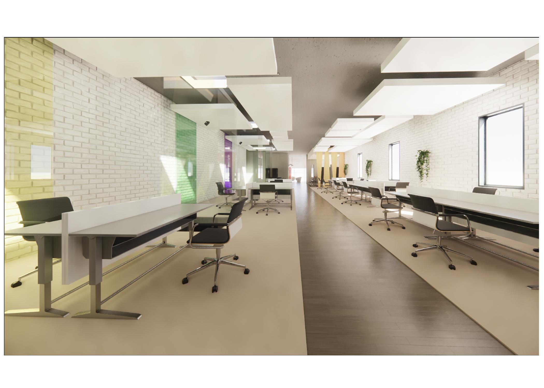 Mimicking the essence of movement, shape, and interchangeability that a camera inhabits, this project utilizes reflection and light to brighten spaces and create an euphoric effect. This further emphasizes the layout’s adaptability to fit the different work spaces and aid with worker’s focus. Attention is brought to the filter of a camera and its reaction to color and light.
