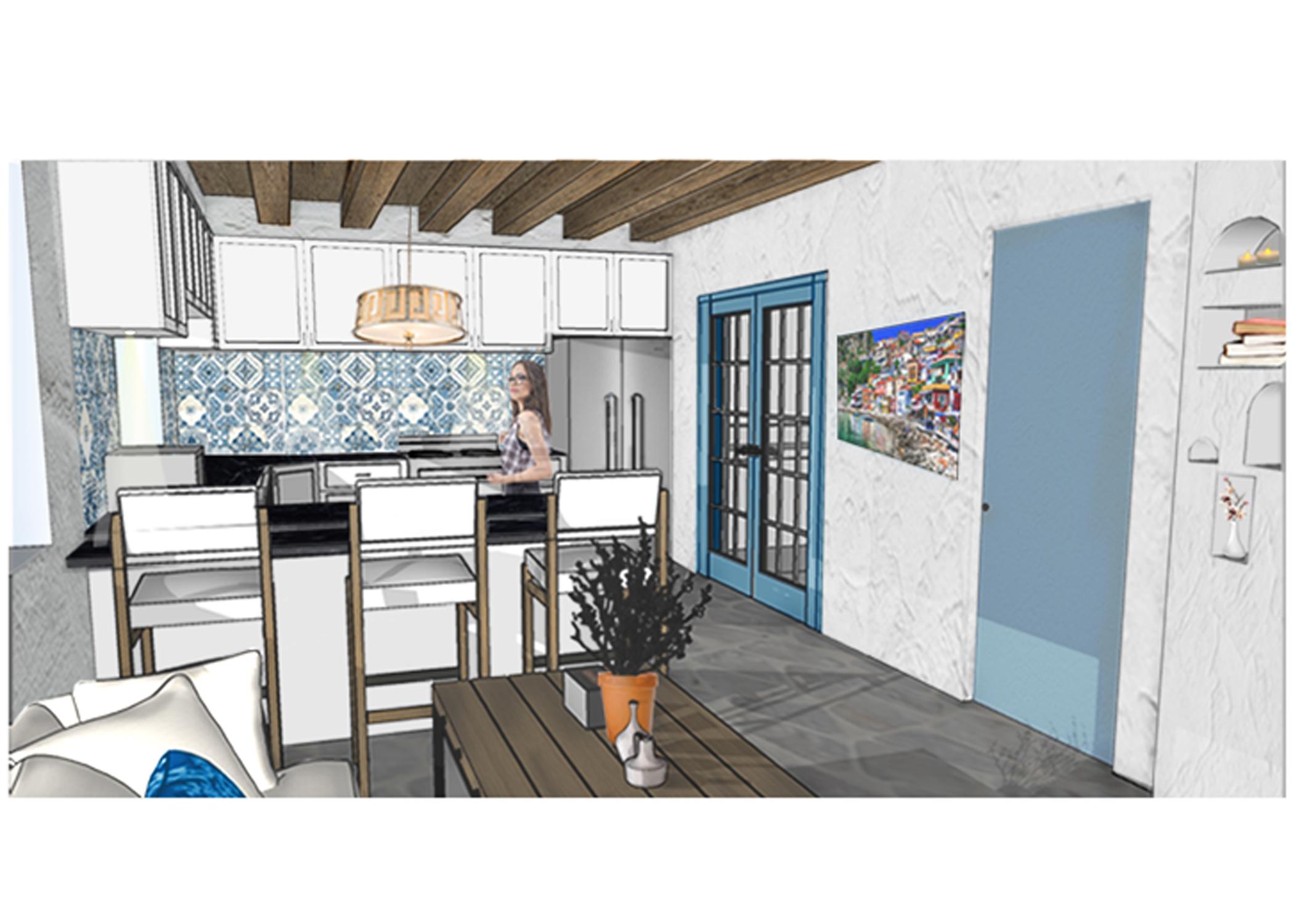 The space is a haven from the traveling and nonstop movement of the artist’s life demands. The design shows a separation of work and living while also bringing aspects of the client’s home country of Greece into the interior with blues, white, and tile. The design provides larger spaces for hosting while also including tucked away bedroom as a retreat. There is also a space to display her pieces with easy access to the studio.