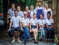 Nella pagina a fianco i titolari Roberto e Alessandra (in piedi al centro) con il resto dello staff e i tortelli alla lastra proposti dall’osteria con la giardiniera