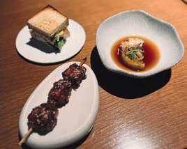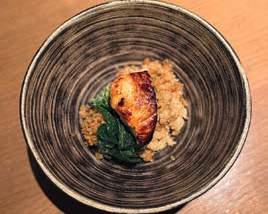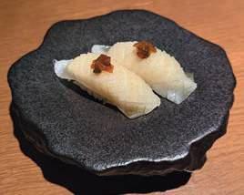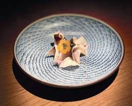 ci limitiamo agli elementi primari e al carattere di ciò che abbiamo mangiato attraverso questa deliziosa girandola gastronomica. Ovviamente il riso e le alghe, “base” del sushi, e pesci e molluschi quali salmone, tonno, sgombro, sugarello, ricciola, gambero, polpo, cappasanta, baccalà. Ma anche l’anatra e il pregiato manzo wagyu e innumerevoli ortaggi e frutti (misticanza, melanzane, spinacini, rape, cipollotti, avocado, lamponi, melagrana...), varie spezie e aromi profumati. E vanno citate le fermentazioni e le marinature per le crudità, le duplici cotture e fritture, le con-