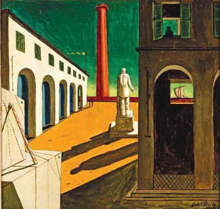 particolare, nell’Enigma d’un pomeriggio d’autunno, compare la prima rappresentazione di quelle che poi saranno note come Piazze d’Italia, che de Chirico dipingerà no agli anni Cinquanta. Nel quadro appare una visione sempli cata della Basilica francescana di Santa Croce con, al posto della statua di Dante, scolpita dallo scultore ravennate Enrico Pazzi nel 1865, una statua antica di spalle. Cosa lega l’architettura alla meta sica di de Chirico? È lo stesso artista, nel 1888, a chiarirlo: «Io ho mostrato per primo la meta sica delle piazze e delle città d’Italia – perché – «nella costruzione delle città, nella forma architetturale delle case, delle piazze, dei giardini e dei paesaggi, dei porti,