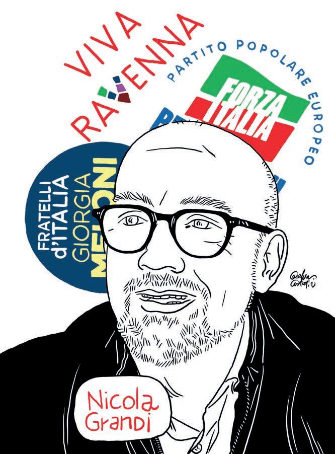 Discorso a parte merita invece il settimo candidato sindaco, Maurizio Miserocchi, un unicum forse nella storia politica della città. Miserocchi infatti si candida senza la reale ambizione di essere eletto, ma come forma di protesta per la gestione del tema piscina comunale. Il suo nome è arrivato solo poche settimane fa, quando sono stati uf cialmente presentati i simboli e i candidati. Per questo non abbiamo potuto inserirlo nella nostra rubrica settimanale (iniziata ben prima) e per questo in questo numero avrà uno spazio diverso dagli altri. È anche l’unico a non essere stato ritratto dall’illustratore Gianluca Costantini, artista ravennate di fama internazionale, in passato nostro collaboratore, a cui abbiamo chiesto per questo numero di “tornare” alle origini e farci i ritratti dei sei candidati che abbiamo seguito con maggior costanza e la prima pagina (dove i lettori più affezionati troveranno una piccola citazione di una sua vecchia e discussa vignetta pubblicata sempre su questo giornale...). Come ormai tradizione del nostro settimanale, per noi la campagna elettorale vera e propria nisce qui. Il prossimo numero sarà dedicato alle informazioni utili per il voto, con i nomi delle centinaia di candidati ai 32 posti per il consiglio comunale. Comunque andrà, per Ravenna si tratta di un passaggio fondamentale perché segna la ne dei nove anni di Michele de Pascale, che da qualche mese guida la Regione.