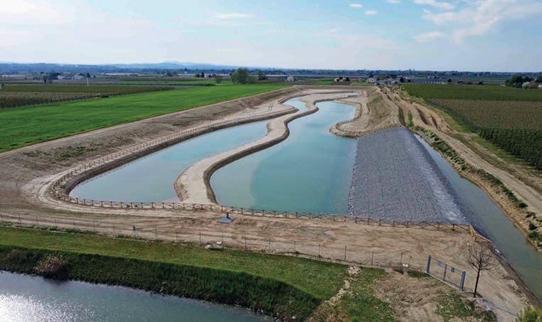 La cassa di espansione è un invaso che occupa una super cie di 6,5 ettari, scavato dopo aver espropriato quello che era un terreno agricolo con alberi da frutto nella zona chiamata “I prati della Cenesa”, un’area che no al XIV secolo aveva mantenuto un carattere quasi paludoso e che solo le più recenti boniche hanno reso coltivabile. Nelle adiacenze si trova il lago arti ciale da 10mila mc della centrale di pompaggio realizzata nel 2011 per l’irrigazione agricola con le acque prelevate dal Canale emiliano-romagnolo (Cer).