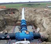 A sinistra la veduta della cassa di espansione. A destra i lavori di realizzazione cominciati nel 2021. Sotto una delle tubature distese per la gestione delle acque