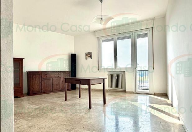 In zona servitissima, luminoso e panoramico appartamento di generosa metratura, ultimo piano con ascensore: ingresso, cucina abitabile collegata col tinello, soggiorno con balcone, disimpegno, 3 camere da letto (possibilità di quarta camera), bagno. Completano la proprietà un grande garage al piano terra e 2 cantine al piano primo sottotetto. APE in corso Euro 215.000