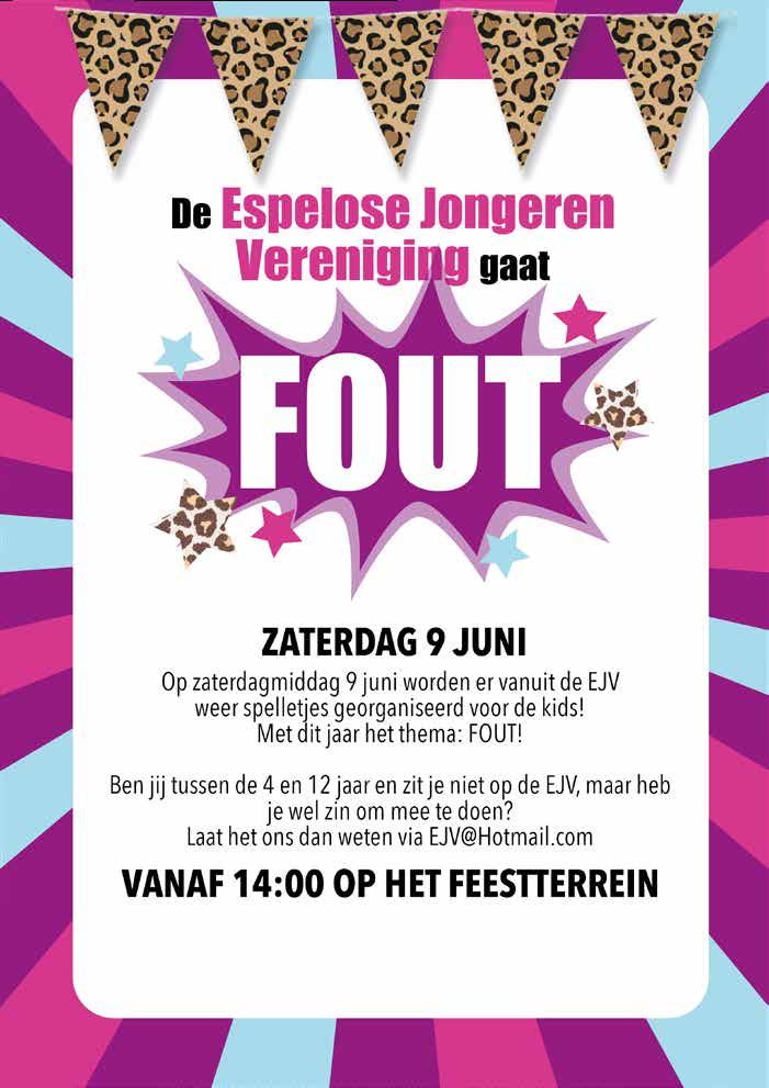 De zaterdag heeft dit jaar een thema gekregen namelijk het thema Espelo’s FOUTE uurtjes. Ik ben nu al benieuwd naar de leuke foute outfits en accessoires van iedereen tijdens de optocht, kinderspelen en volksspelen. Voor de foute zaterdagavond hebben we een heel afwisselend programma met onder andere Dj Sjors, Dj Timmie, zanger Raymon Hermans, Orlando Uitenwerf, Wolfgang Saufi, & feestband Staal met glazen.