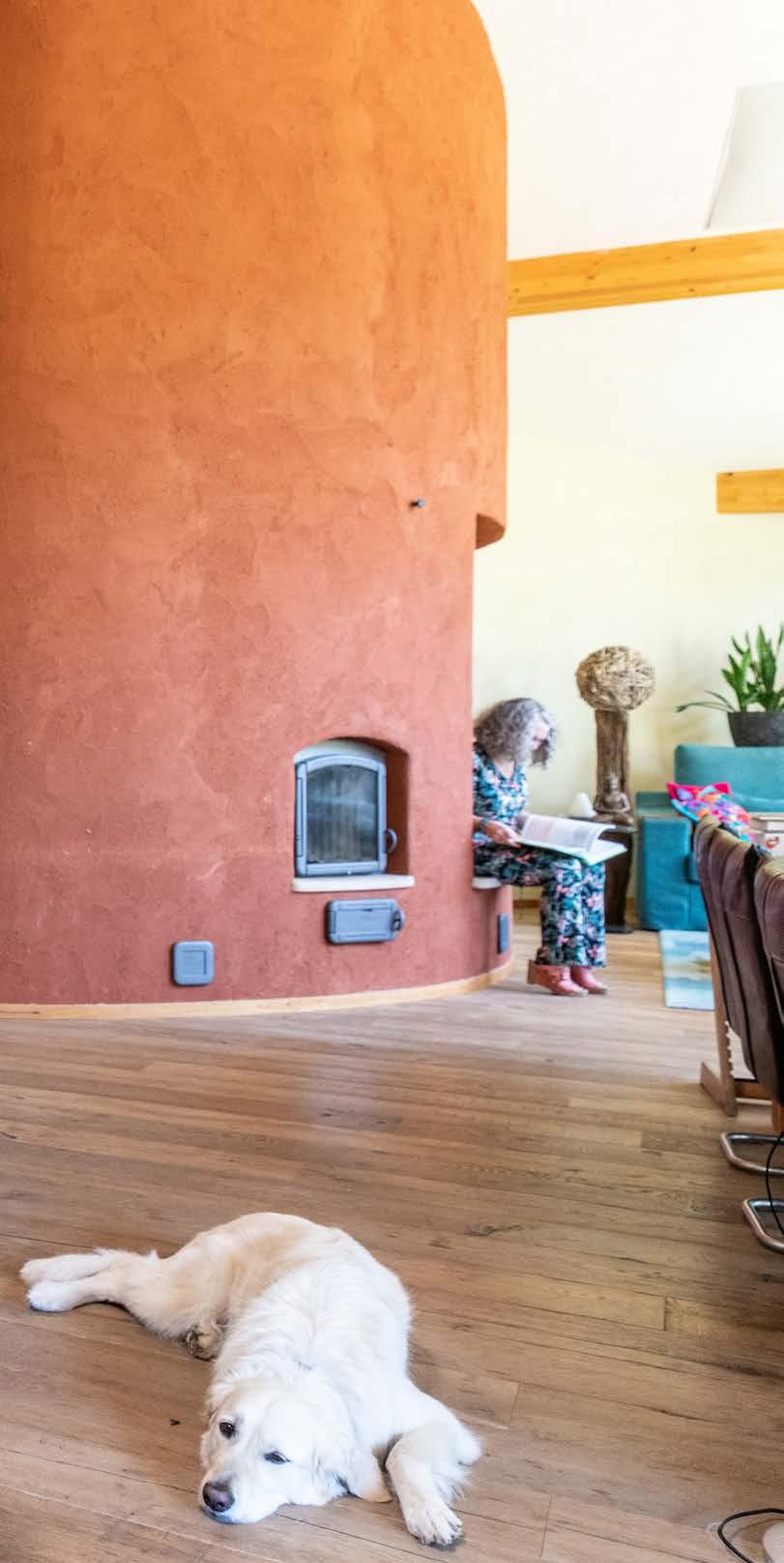 “De muren zijn voorzien van ecologisch leemwerk. Door de leemkachel hebben we, na het stoken, 48 uur lang warmte van de muur. De muren in het huis zijn gewoon geïsoleerd, maar dan met oud papier. En alles in ons huis is gerecycled. De stenen van de leemkachel zijn afkomstig uit Drenthe en de stenen in de binnentuin uit België. De binnentuin bestond in het eerste ontwerp uit glas. Dit was voor ons geen optie, want de praktijkruimte van Rita en de slaapkamers grenzen aan de binnentuin. Ik heb lang op internet gezocht en op een gegeven moment kwam ik een plaatje van een stenen muur tegen. Hier waren de stenen niet netjes gemetseld. Deze afbeelding hebben wij als inspiratie gebruikt. Het lijkt nu echt alsof deze muur uit het oorspronkelijke huis is blijven staan.”