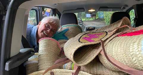 wat lekkers. Wie al snel de ruimte had gescand, zag allemaal riet gevlochten strandtassen met leren hengsels, flessen verf, penselen, scharen, glitters, bandwerk, föhns en jawel… de lijmpistolen klaarliggen.