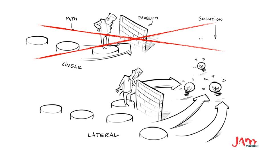 Hij neemt een willekeurig probleem, ter verduidelijking van de vaardigheid ‘reframing’. ‘De lift is niet snel genoeg. Wat zou daar nou een goede oplossing voor zijn? Negen van de tien mensen denk aan extra motor of een sterkere motor, zodat de lift harder kan. Maar je kunt ook omdenken, het probleem vanuit een ander perspectief bekijken. Waarom gaat de lift niet snel genoeg?