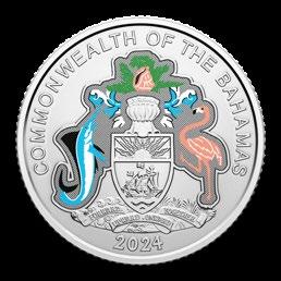 Elements of the national coat of arms on the obverse have been selectively coloured, with the year of issue updated below. Painting on the reverse includes the artist’s rendering of a native sloop, in red, white, and brown, in addition to a blue sea. Wording on the reverse has been updated to include ‘The Central Bank of The Bahamas and ‘50th anniversary 19742024’.