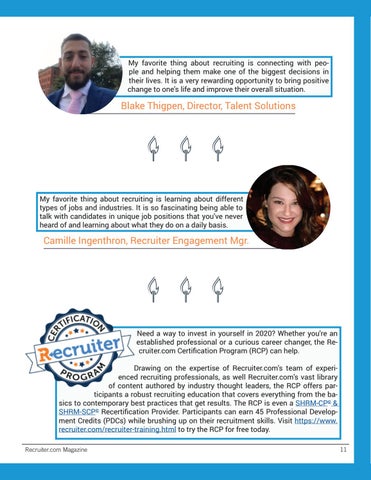 Need a way to invest in yourself in 2020? Whether you're an established professional or a curious career changer, the Recruiter.com Certification Program (RCP) can help. Drawing on the expertise of Recruiter.com's team of experienced recruiting professionals, as well Recruiter.com's vast library of content authored by industry thought leaders, the RCP offers participants a robust recruiting education that covers everything from the basics to contemporary best practices that get results. The RCP is even a SHRM-CPŠ & SHRM-SCPŠ Recertification Provider. Participants can earn 45 Professional Development Credits (PDCs) while brushing up on their recruitment skills. Visit https://www. recruiter.com/recruiter-training.html to try the RCP for free today. Recruiter.com Magazine