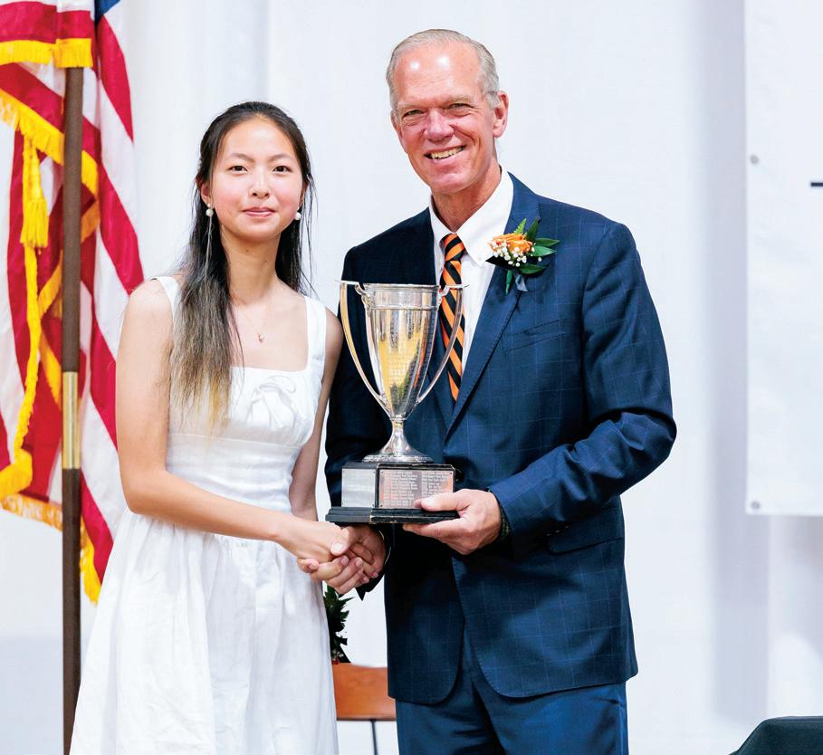 Jackson A. ’25 makes a move against an opponent during an early-season Varsity Hockey game. Swimmers Chris C. ’25, Arvin S. ’27, Leon L. ’26, and Oscar Z. ’29 take a breather during practice. Mary-Allegra T. ’27 and Miley L. ’26 celebrate after the Cross Country team captured the Small Division title at the 2024 QVJC League Championship. Coach Roy reviews critical plays with the Boys Varsity A Basketball team during a tight home game. The Girls Varsity Basketball team celebrates with Coach Bradley and Coach Hart after capturing the championship at the Newton Country Day Tournament. Coach Ames huddles with the flag football team, sharing play details ahead of the Fall Family Weekend scrimmage. Nina Z. ’26 practices her swing at Connecticut National Golf Course.